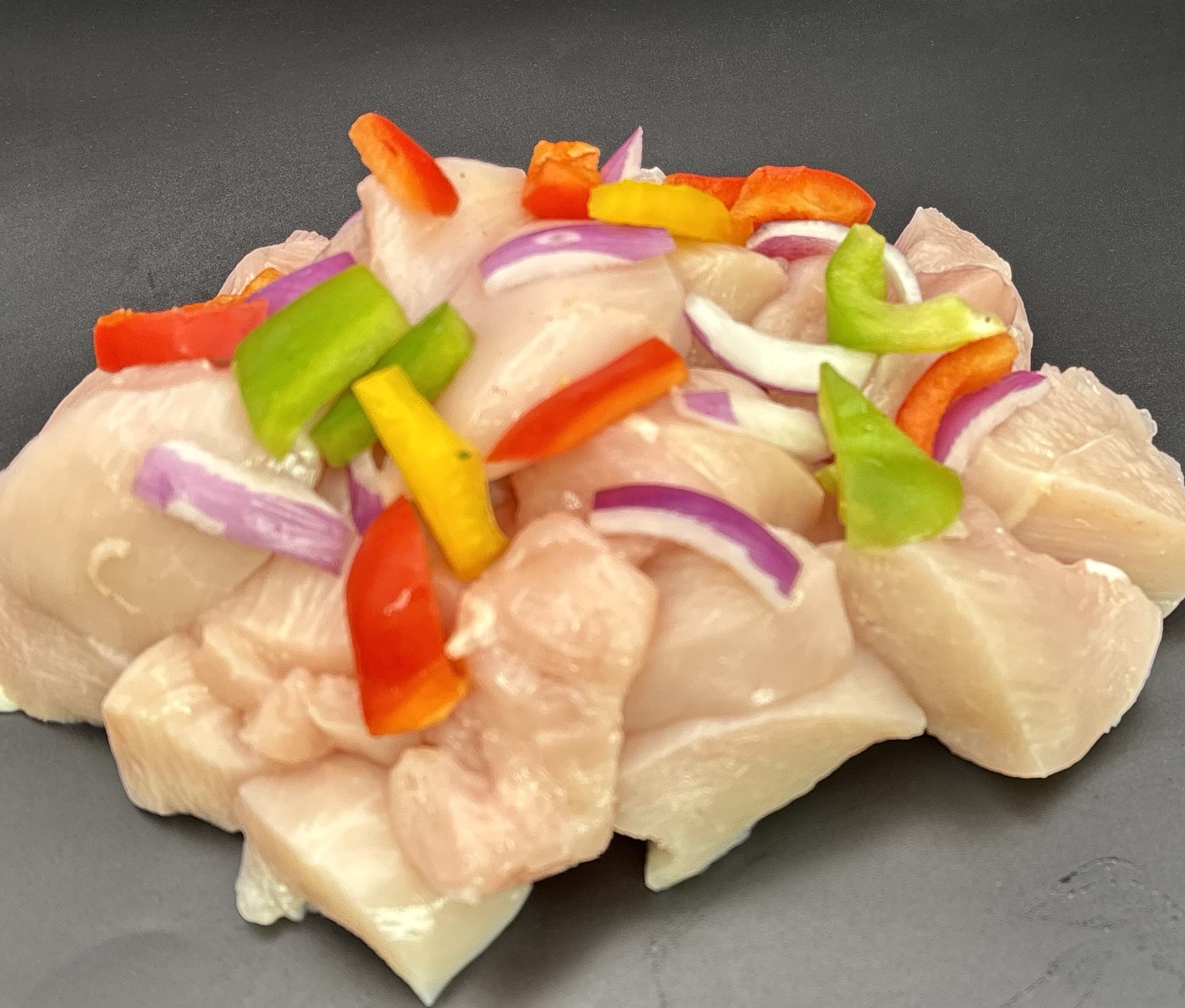Homemade chicken stir-fry with fresh chopped peppers and red onion.