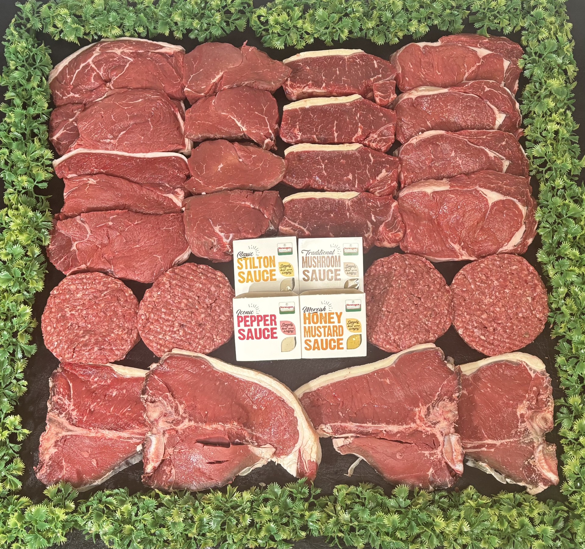 | Choose Steak Sauce 4 | Pepper, Steak Diane, Mushroom, Stilton, Smokey BBQ, Honey & Mustard, Sweet Chilli |